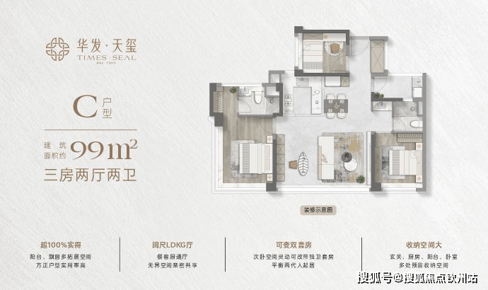 约99㎡3+1房两厅两卫:约35㎡LDKB厅餐客一体化设计,可变双套房;270°无遮挡视野,室内空间通透