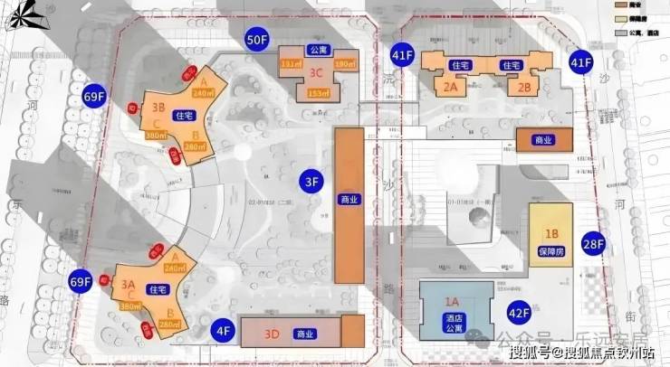 总栋数:8栋(1A栋42层酒店+公寓、1B栋28层保障房,2栋1/2单元41层住宅,3A/3B栋69层住宅;3C栋50层公寓、3D栋4层公寓)