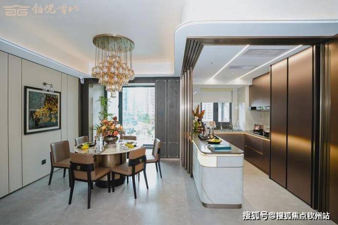 厨房开合也区别于传统墙体封闭操作,铂悦香山升级采用开放式L形三折叠推拉落地玻璃门,让厨房可以与外面空间的联系收放自如,既能增加空间的通透感,也能带来更丰富的社交场景。
