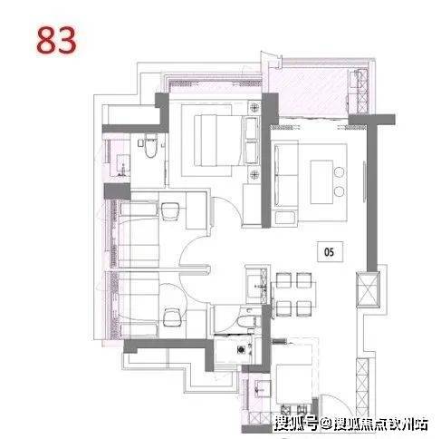 83平(3房2厅2卫)户型特点:达到约90%的极高使用率,区域内唯一80出头能做到三房两卫,厨房U型布局+双卫,小户型天花板。