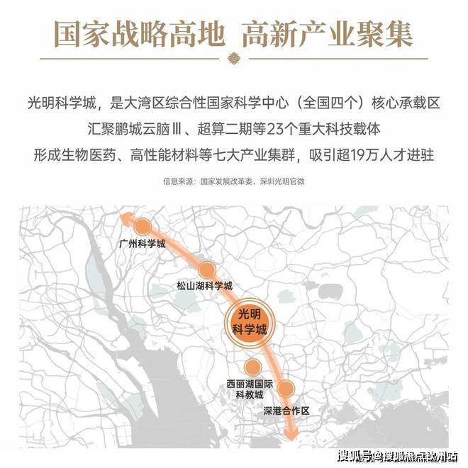 光明科学城,是大湾区综合性国家科学中心(全国四个)核心承载区,汇聚鹏城云脑Ⅲ、超算二期等23个重大科技载体,形成生物医药、高性能材料等七大产业集群,吸引超19万人才进驻。
