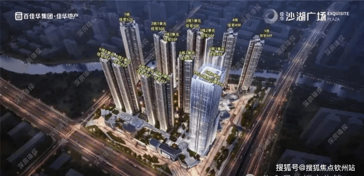 由佳华集团操盘,总占地面积约8.17万㎡,总建筑面积约62.2万㎡,计容建筑面积约42.6万㎡,容积率5.21,绿化率30%,共由6栋14个单元总高44-52F的住宅组成,其中1栋回迁房52F,2栋1/2单元回迁房50F,3栋1/2单元商品房50F,4栋商品房49F,5栋商品房44F,6栋1/3单元商品房46F,6栋2单元商品房47F,6栋4/5/6单元回迁房46F,6栋7单元办公+商务公寓45F,7栋规划1所幼儿园。