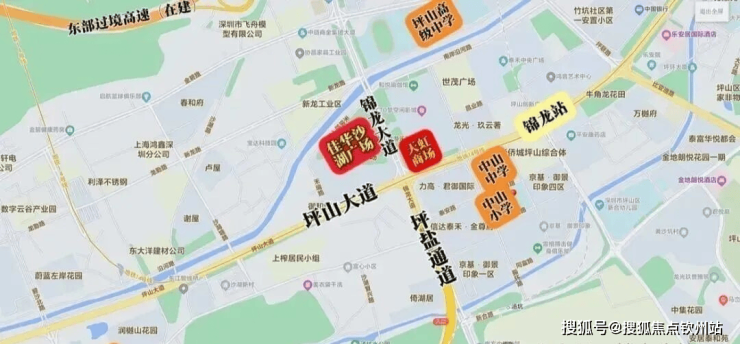 佳华沙湖广场项目位于坪山区坪山大道与锦龙大道交汇处西北角(14号线地铁锦龙站旁),项目是包含商业、办公/公寓、住宅、幼儿园于一体的大型综合体,总建面超62万㎡。隔壁是深业国际东城、力高君御国际等住宅区。