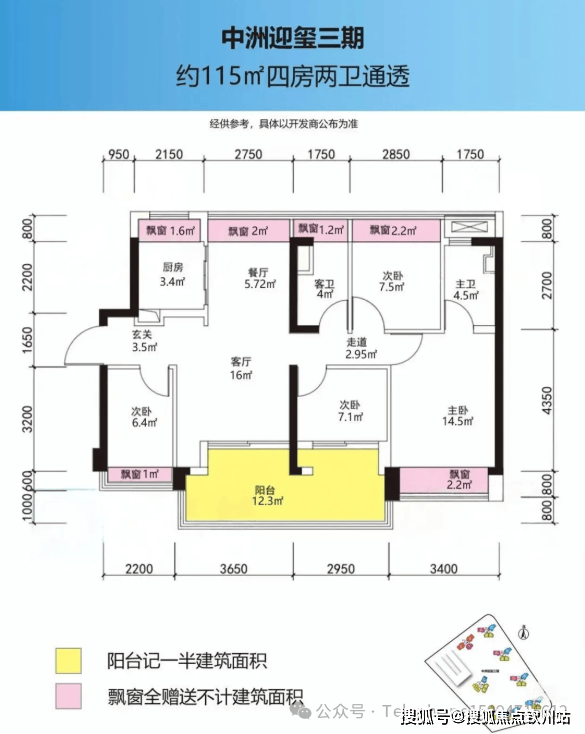 115㎡的4房2厅2卫,设计的是竖厅南北通透格局,进门入户玄关,客厅3.65米开间,LDKB一体化设计,四开间朝南,4个卧室分别做到了主卧16.7㎡/次卧9.7㎡/次卧7.4㎡/次卧7.1㎡(包含墙体飘窗),客厅连接次卧出6.6米长的大阳台,U型厨房,卫生间干湿分离,赠送面积高达16.35㎡,阳台主朝正南或东南向。