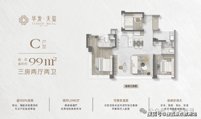 约99㎡3+1房两厅两卫:约35㎡LDKB厅餐客一体化设计,可变双套房;270°无遮挡视野,室内空间通透