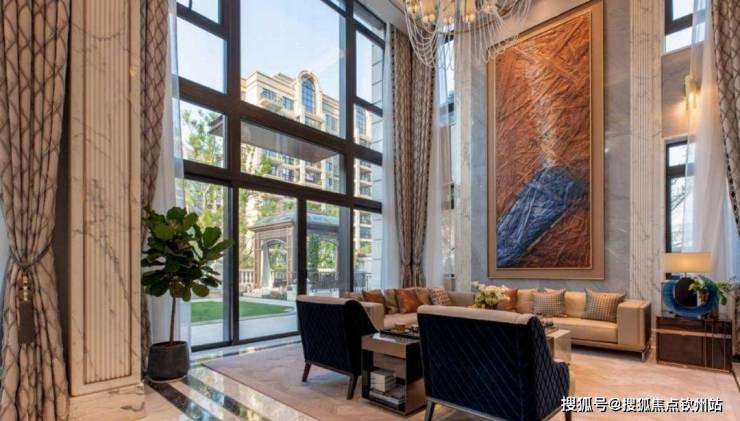 以约620-693㎡的样板房为例,设计为地上3层+地下1层,地上每一层层高达到3.6米,客厅挑高7.2米,开间做到了11.3米。