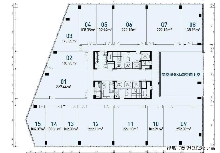 标准层占地面积约为2747平方米,总计24个办公单位,每个单位的产权面积介于67至236平方米之间。