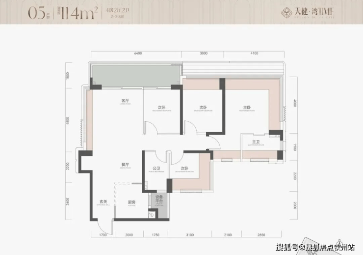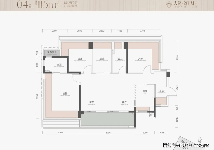 115㎡4房2卫,横厅户型,朝南看海,入户独立玄关,但三个次卧朝北;