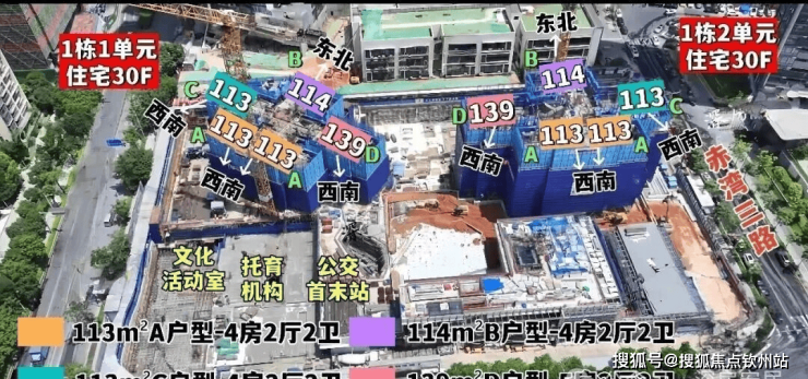 整体以朝南及西南为主,有两套114㎡朝东北面向金众。
