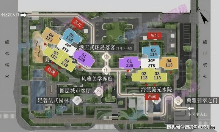 3、部分户型遮挡:3 层及以下受天后博物馆与周边楼栋遮挡,无海景;05户型为东北朝向,日照时间短,视野受限;