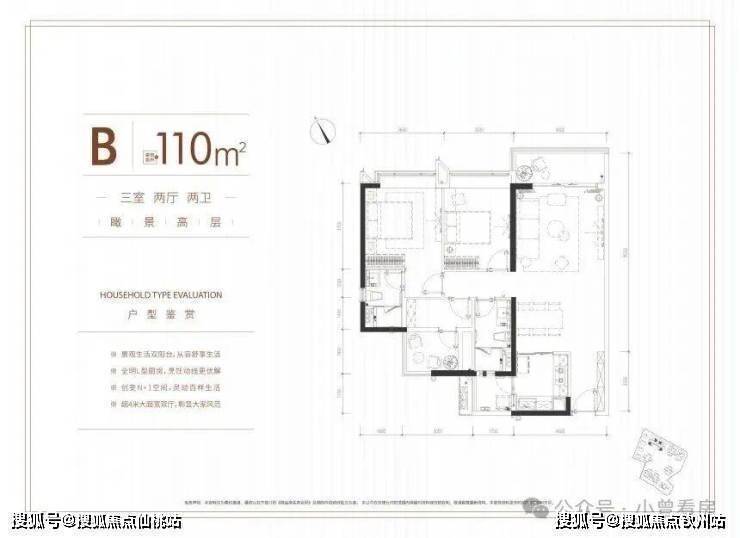 其中 B 户型带景观和生活双阳台,厨房是全明 L 型设计,客厅面宽达到 4 米,空间显得通透;
