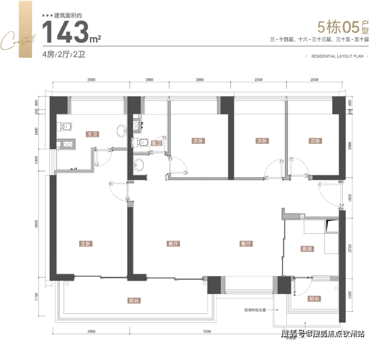 建筑面积约143㎡的4房2卫,同样是大横厅的设计,通透采光。客餐厅约7.05米开间,横厅设计,客厅直连观景阳台,餐厅有飘窗,通风采光优越;超7米大开间观景阳台,客厅和次卧阳台直连,极致观景面;主卧超级大衣帽间和卫生间,阔绰舒适主人房;双阳台多飘窗,提高室内使用率。