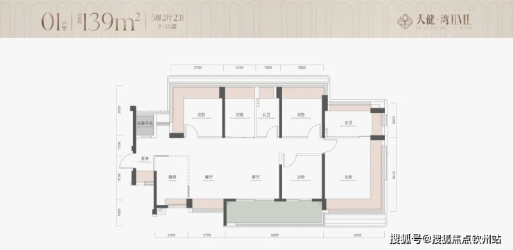 139㎡五房两厅两卫,奢阔空间:横厅设计,6.8米开间阳台与客厅一体化,可灵活划分家庭互动区和休闲区;全明户型,所有房间均带飘窗或窗户,无暗房。