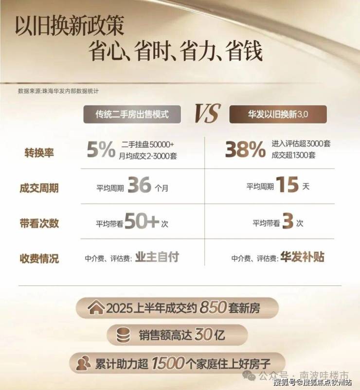华发以旧换新,珠海首创“收购+帮卖+补贴”模式,业务成交量全国领先,2025上半年成交量约850套,超2024全年业绩总量,新房销售额高达30亿,累计助力超1500个家庭住上好房子!(数据来源:珠海华发内部数据统计)