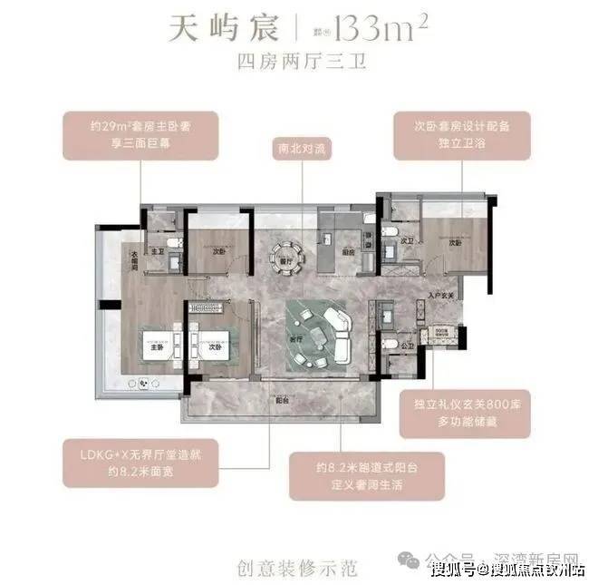 133㎡的4房2厅2卫,设计的是竖厅南北通透格局,进门入户玄关,客厅5.4米开间,餐客厅分离设计,客厅连接次卧出12.3m²的观景大阳台,L型中式+岛台灵动式厨房,公卫三段式干湿分离,得房率约78.27%(不含赠送),阳台主朝东南或西南向。靓点:超大客餐厅南北对流+8.2米长超大观景南向阳台,超大主卧+270°无柱转角飘窗。
