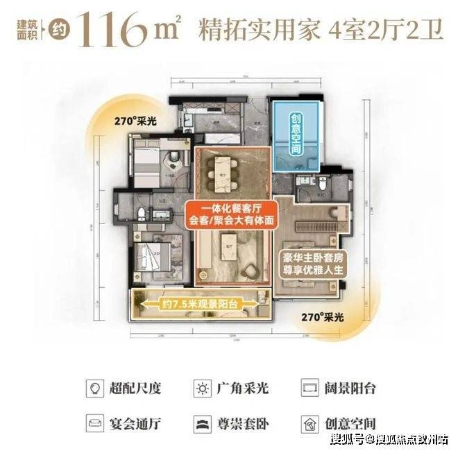 空间革新:约130%使用率,户户【3+X】创意空间,南北对流,270°采光,大尺度阳台,演绎奢适日常;