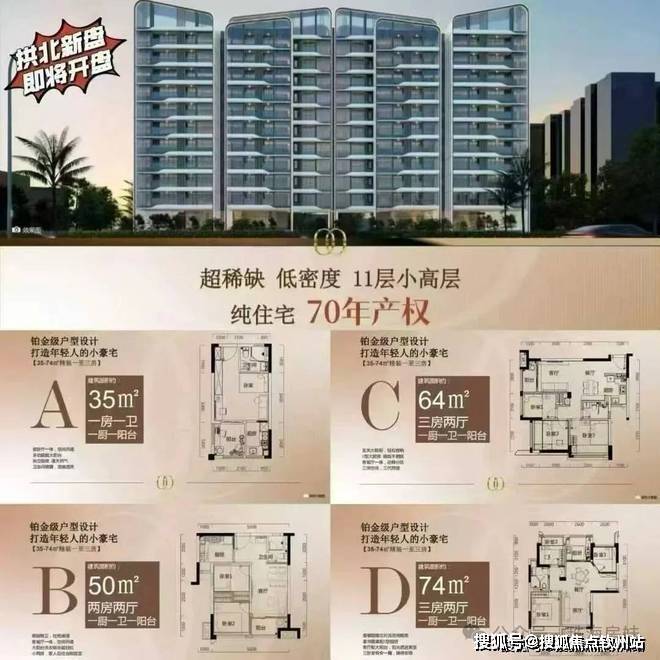 约64㎡、约74㎡户型,为三房两厅一卫,能够满足三代同堂需求。