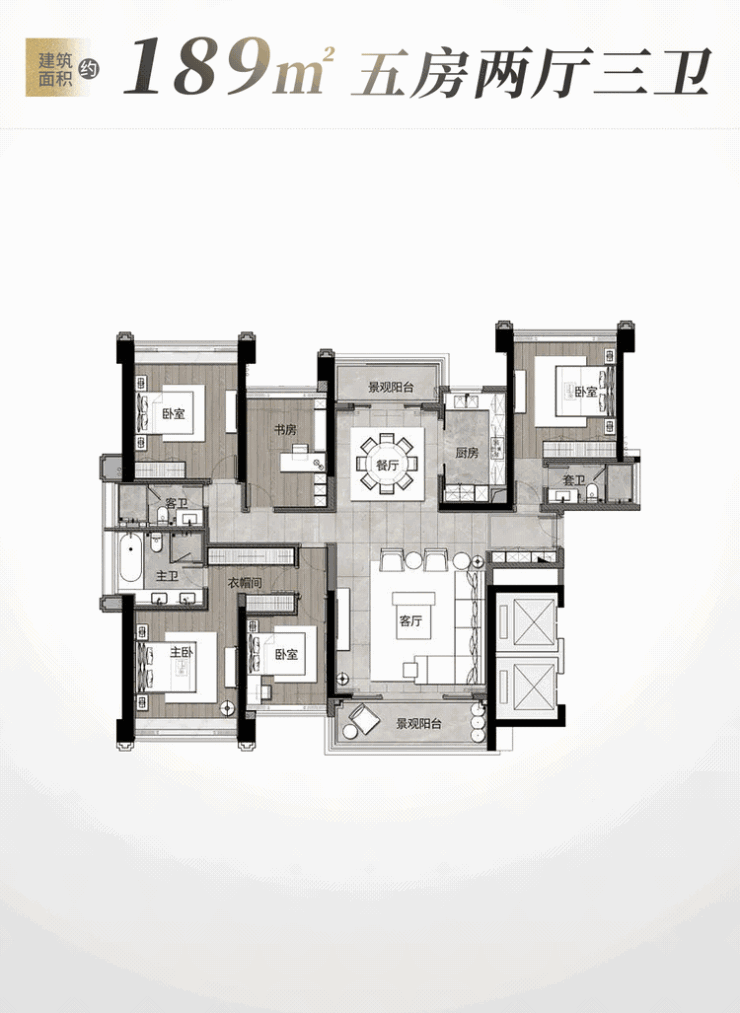 项目涵盖建面约89-189㎡三至五房,每款户型都实现超尺度空间体验,最高实得率超100%。