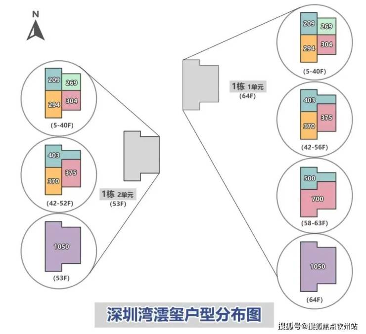 1栋公寓250米,4栋住宅分别150米、200米、200米、240米。层高3.3米,约40-70层(不含底商)。