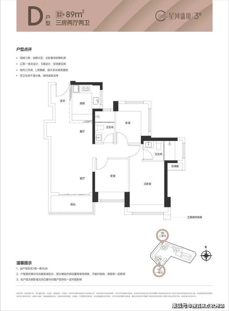 (3)89㎡的3房2厅2卫,折后总价289-316万/套,单价3.24-3.54万/㎡。