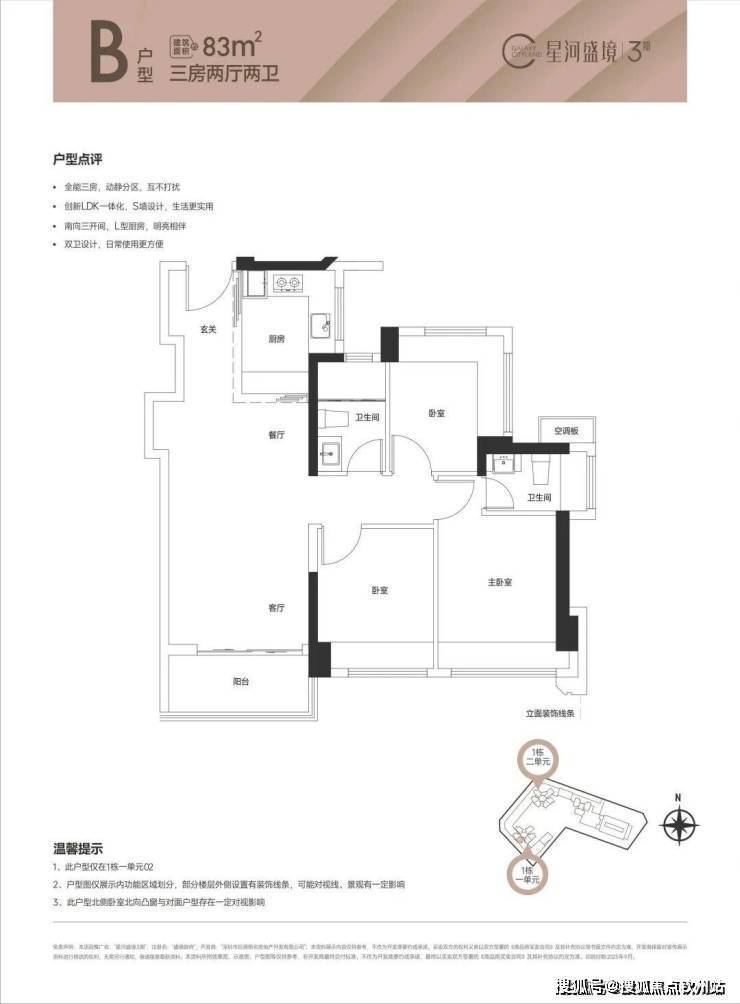 83㎡的3房2厅2卫(1栋1单元01/02户型),设计的是竖厅格局,创新LDK一体化餐客厅,S墙设计预留冰箱位,三开间朝南,次卧270度环幕设计,U型厨房,卫生间干湿分离,得房率80.07%(不含赠送),全部西南朝向。