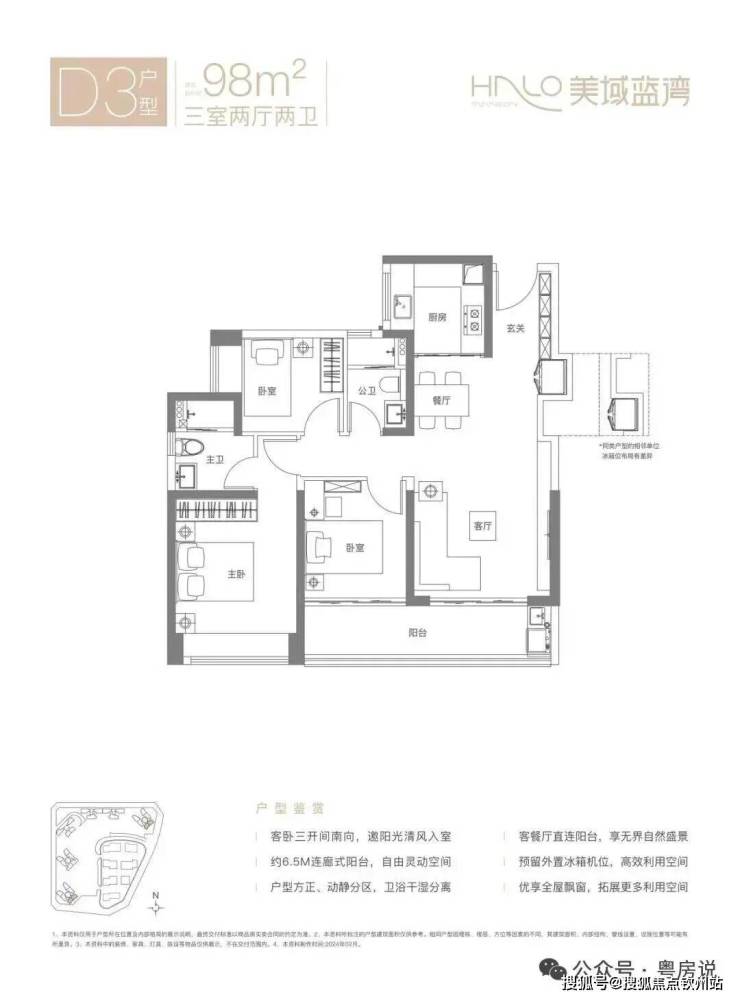 98㎡的3房2厅2卫,D1户型,经典竖厅格局,客厅3.7米开间,LDKB一体化设计,S墙设计预留冰箱卡槽位,动静分区,客厅连接次卧出6.5米长的大阳台,U型厨房,卫生间干湿分离,得房率约80.12%(不含赠送),西南或东北朝向。