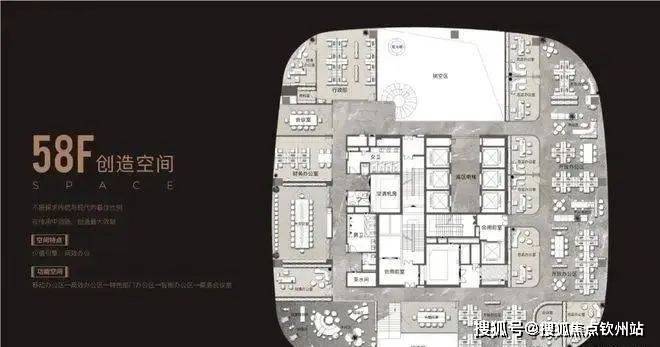 58层——天际引擎 主要针对企业的中高层管理人员及重要的后台职能部门,设计上更加科学稳重,私密性较57F更强,各职能分区既独立又包容,最大化促进企业中枢部门的协作效率;