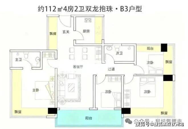 约105-122㎡四房:作为“功能型品质起步”户型,凭借新规下的高实用率(包含赠送得房率约100%)。主卧均带270°环绕式飘窗,户型设计通过飘窗“送了不少面积。