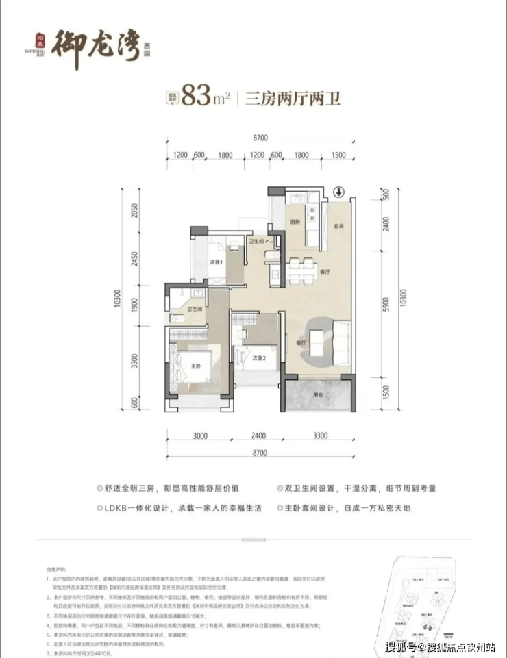 83㎡3房2卫,分布在2栋1/2单元02/05户型,设计的是竖厅格局,客厅开间3.3米,LDKB一体化设计,三开间朝南,U型厨房,公卫三段式分离设计!