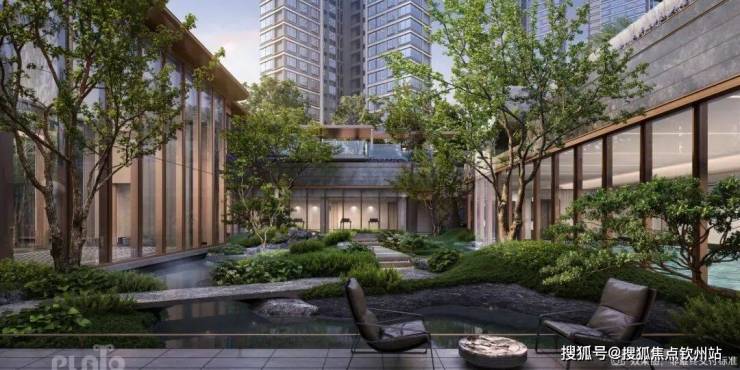 ②仪式感泗水归堂:镜面水庭设计,精选乔木铁冬青(旺宅的寓意)和镜面的水面结合,运用中国东方格局对称美学,借鉴皇家庭院的环抱对称,承载着‘聚水生财’的美好寓意