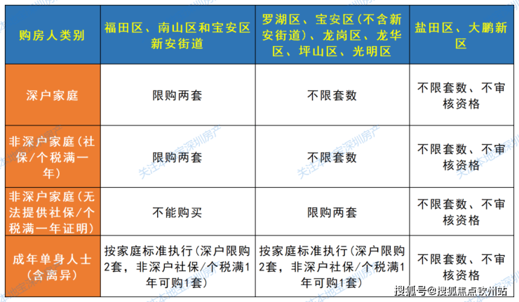 深圳户籍居民家庭限购2套、在深圳连续缴纳社会保险或个人所得税满1年及以上的非深圳户籍居民家庭限购1套。