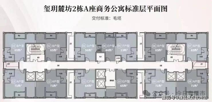 目前在售的商务公寓户型包括44㎡的1房、53-56㎡的1房以及63-65㎡和71㎡的2房2厅1卫。