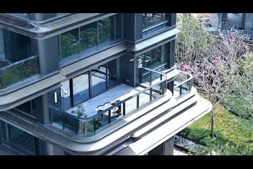 建筑采用“未来舱”式设计,外立面以大面积玻璃和几何线条打造现代质感,空中花园平台错层布置保障隐私。
