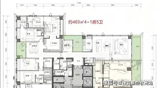 403㎡:五房五卫 + 家庭厅 + 家政套间,北向,空间更方正