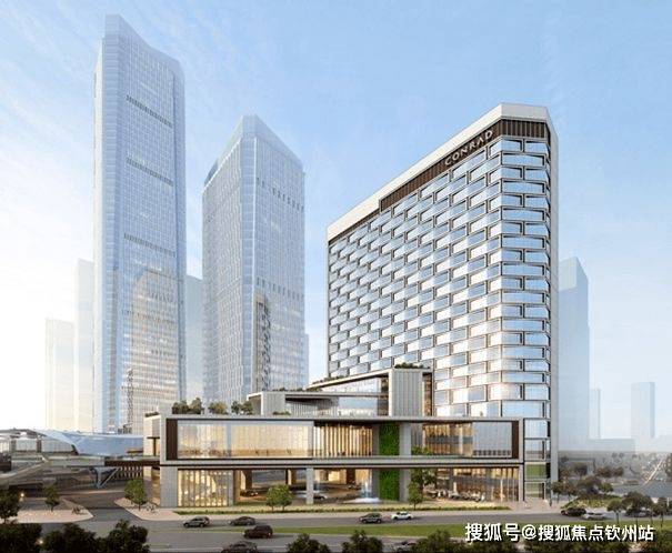 酒店为希尔顿旗下的康拉德酒店品牌,拥有298间五星级酒店客房,配套服务设施位于多个楼层,并在西侧设置景观屋面花园。这些配套空间面向相邻的城市绿带和前海湾,为客人提供了极佳的绿色视野和海景。客房充分利用大型落地玻璃窗来得到最佳的观赏视野,并且多个不同的优质配套设施空间和用餐空间使得此酒店成为区域性休闲中心。