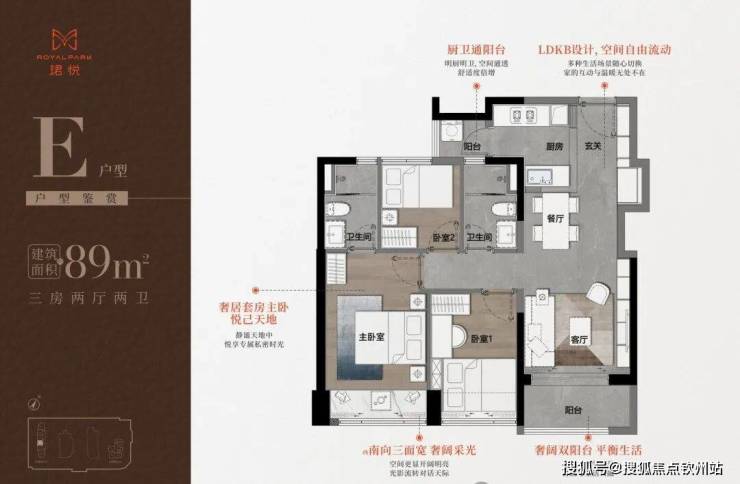 (1)89㎡三房:包含A/B/C三种户型,采用竖厅或横厅布局,三开间朝南,U型厨房与三段式公卫提升实用性。部分户型配备5.6米观景阳台,主卧双飘窗设计增加采光。