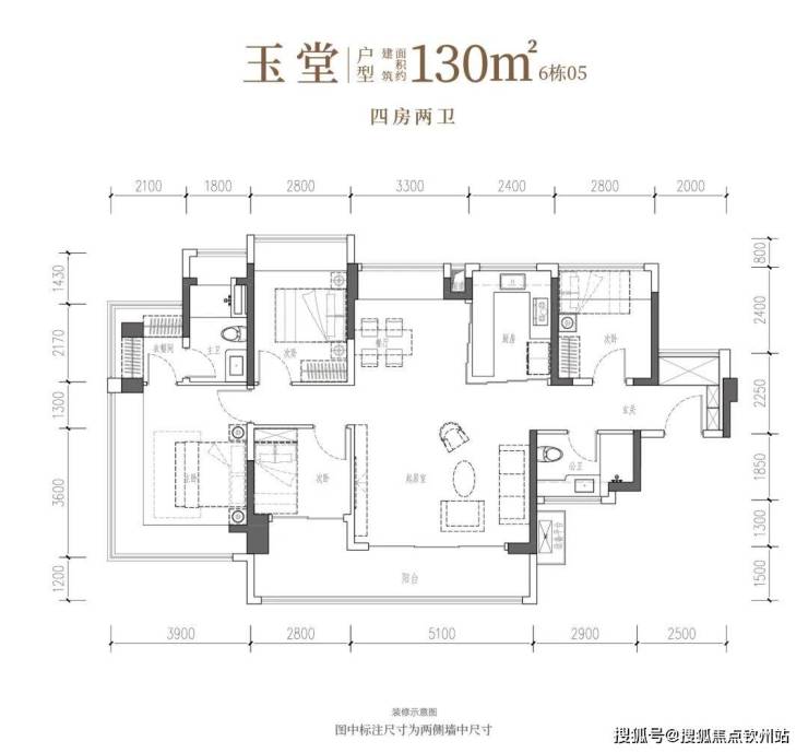 •玉堂·建面约130㎡4房2厅2卫:南向四开间,约14.7米IMAX光幕,尺度自成。