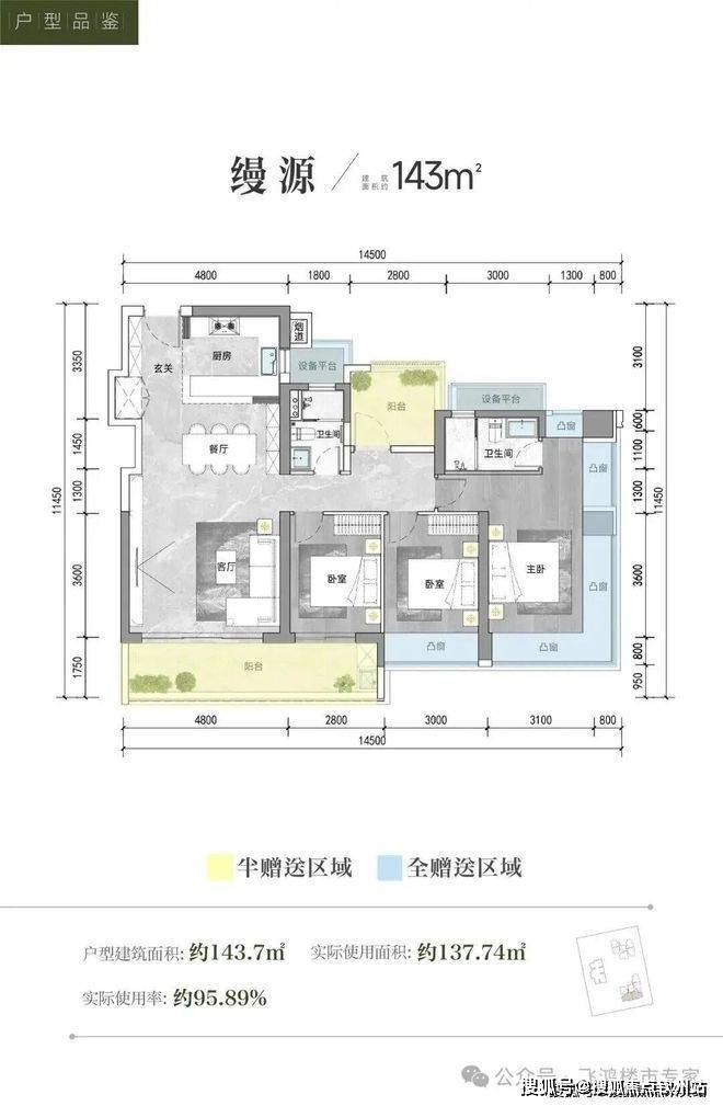 设计的是经典竖厅格局,进门入户玄关,超大宽面客厅5米开间,LDKB一体化,S墙设计预留冰箱卡槽位,三开间朝南,3个卧室分别做到了主卧16.62㎡/次卧11.31㎡/次卧7.28㎡(实测面积),U型厨房,卫生间干湿分离,还带2个设备平台,得房率约96.1-96.69%(包含赠送),东南或东北朝向。
