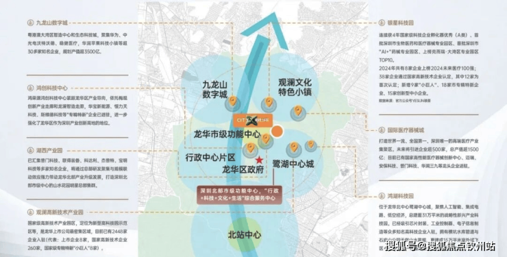 观澜占据龙华70%产业,鹭湖中心城与九龙山数字城双核驱动,聚焦人工智能、生物医疗等高新技术产业;