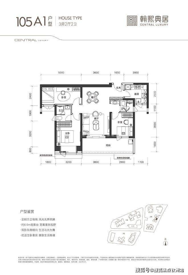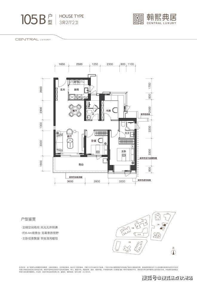 建面约 105㎡的 3 房 2 卫户型:有 A、B 两种布局。A 布局为双龙抱珠格局,入户无走廊浪费,客厅居中,两侧分布卧室,私密性强。6.5 米景观阳台连接客厅与次卧,拓展活动空间且采光好。A1 户型为东南朝向,高层可远眺深圳湾海景;A2 户型为正南朝向,可俯瞰小区园林。B 布局为竖厅设计,客餐厅一体化纵向排布,连接南向阳台,通风采光俱佳,厨房为 U 型设计,操作动线流畅。该户型朝向为正南或东南朝向,阳台直面小区花园。