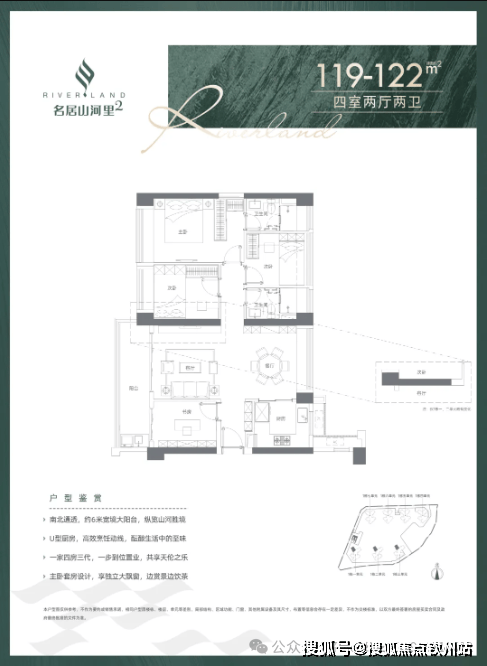 119-122㎡的4房2厅2卫,设计的是竖厅南北通透格局,客厅3.8米开间,四开间朝南,全屋飘窗,U型厨房,得房率:74.83%(不含赠送),阳台1.5米进深,6米长超大阳台,主朝西南向。