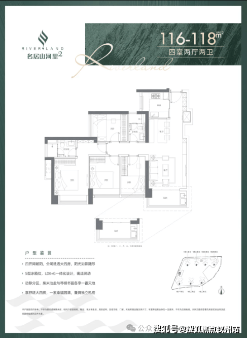 116-118㎡的4房2厅2卫(04户型),设计的是竖厅格局,客厅3.7米开间,S墙设计预留冰箱位,四开间朝南,U型厨房,得房率:73.85%(不含赠送),阳台1.5米进深,东南向。