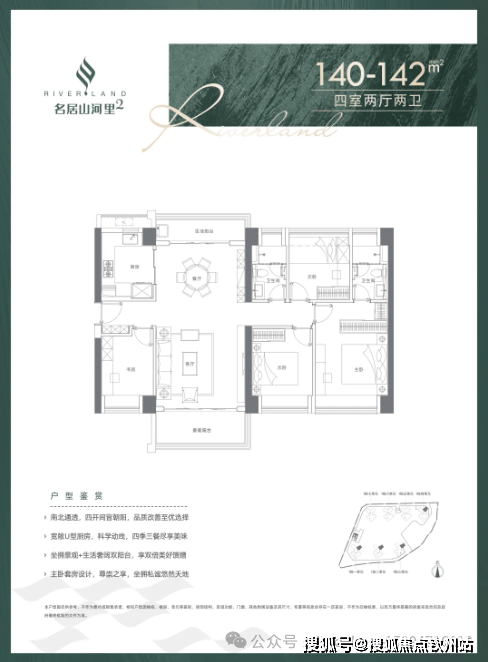 141㎡的4房2厅2卫,设计的是竖厅格局,客厅4.3米开间,南北通透双阳台,四开间朝南,全屋飘窗,U型厨房,得房率:74.83%(不含赠送),阳台1.5米进深,主朝东南向。