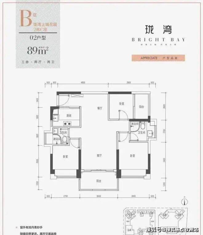 2、户型:建筑面积约89㎡三房两厅两卫,东南朝向,双阳台,主卧套房设计