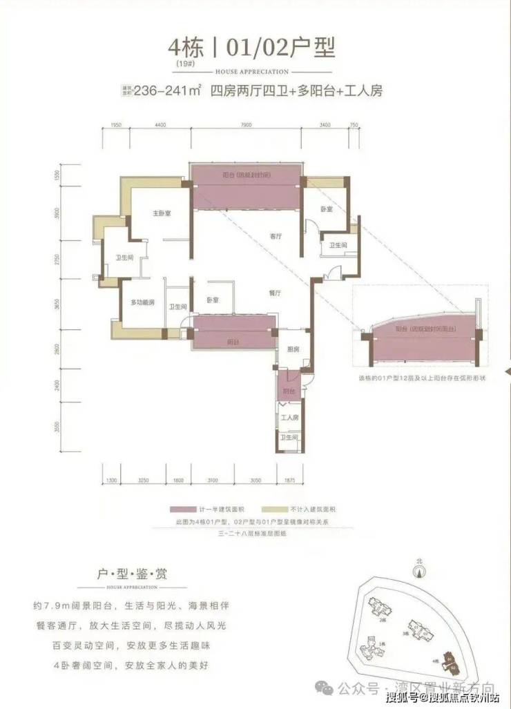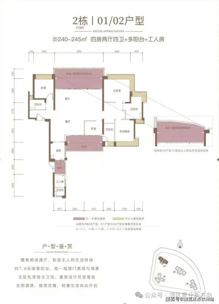 2栋两梯两户、01-02户型239平方、四居两厅三卫双阳台、客厅阳台朝东北、生活阳台朝西南。