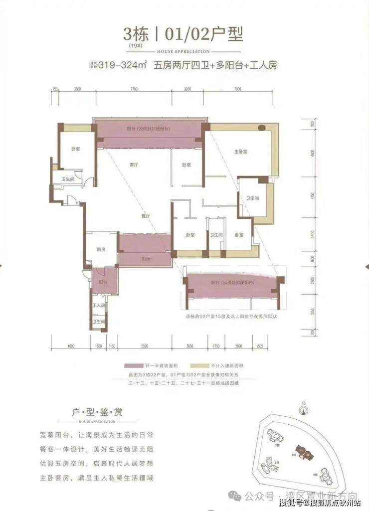 3栋两梯两户、01-02户型322平方,五居两厅三卫双阳台、客厅阳台朝东北、生活阳台朝西南。