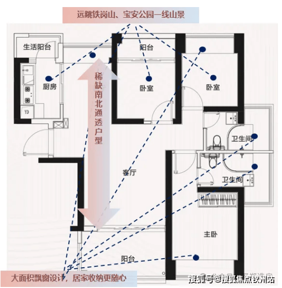 南北通:稀缺端头位,客厅、主卧东南、次卧西北,南北通透,采光、通风无忧