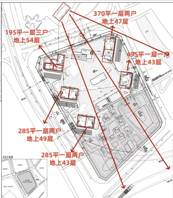 项目将建5栋超高层,包括1栋A座43层、1栋B座47层、1栋C座54层、1栋D座49层以及1栋E座43层,规划停车位938辆。