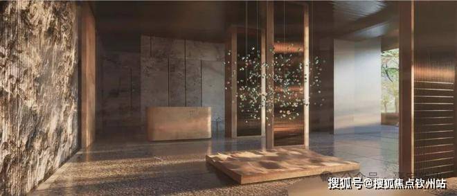 入口50米横向面宽,近6米的高跌水景墙与双层门楼让回家有了一份尊贵与隐奢;随着动线经过穿林,见山,伴水,来到模仿山石色调与铜色金属融合打造的酒店式大堂,一路草木清香、青石铺地、水系流动,自然的隐奢之美扑面而来。