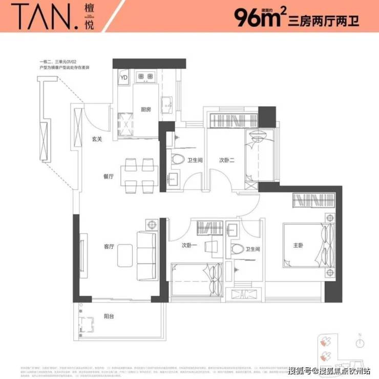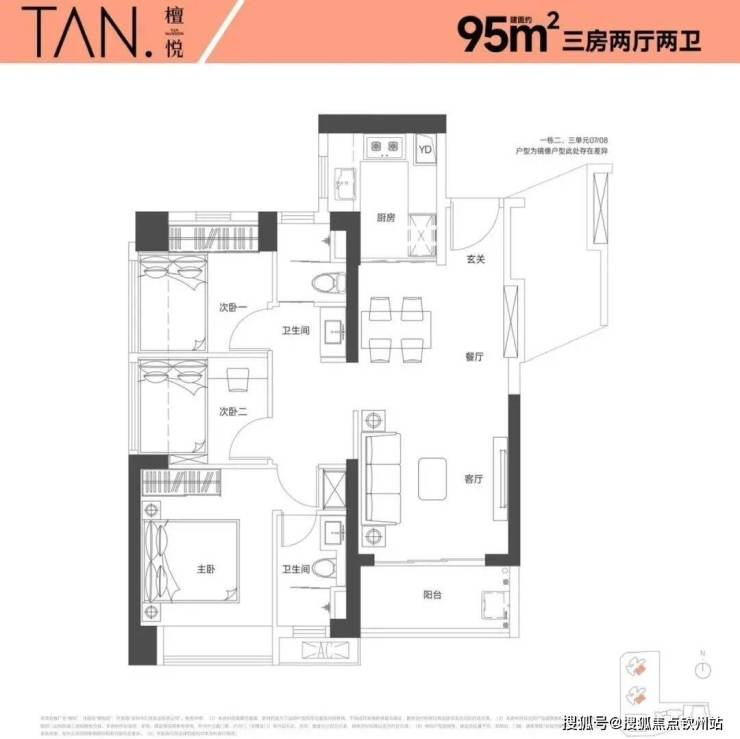 95㎡的3房2厅2卫,设计的是经典竖厅格局,LKDB一体化设计,进门入户玄关,动静分区,三开间朝南,有1个次卧做的双飘窗,U型厨房,得房率:74.34%(不含赠送),全部西南朝向。